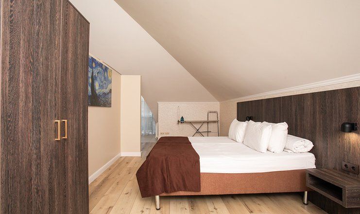 В номере: кровати двуспальные, кухонная мебель, набор мягкой мебели, прикроватные тумбочки, стол, столик журнальный, стулья, шкаф, гладильная доска, кондиционер, микроволновая печь, набор посуды, сейф, сплит-система, телевизор ЖК: 3, телефон, утюг, холодильник чайная станция и бутилированная вода