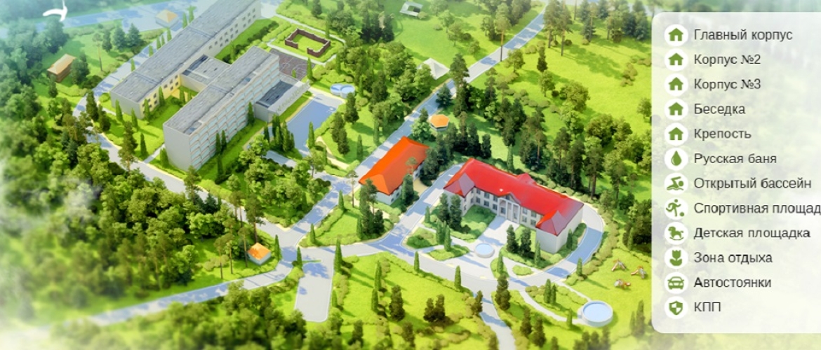 Детям: детская игровая и спортивная площадка, детская комната с воспитателем, детские стульчики в столовой, детские кроватки, врач-педиатр.