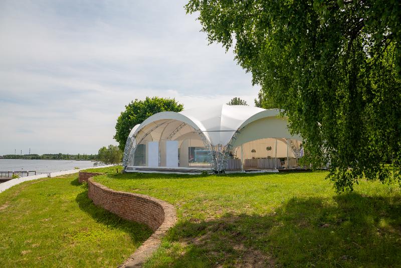 Белоснежный шатер стабилизировался в уединенной зеленой зоне с видом на Волгу.